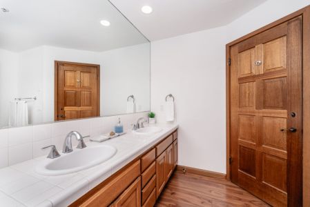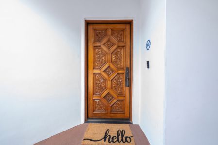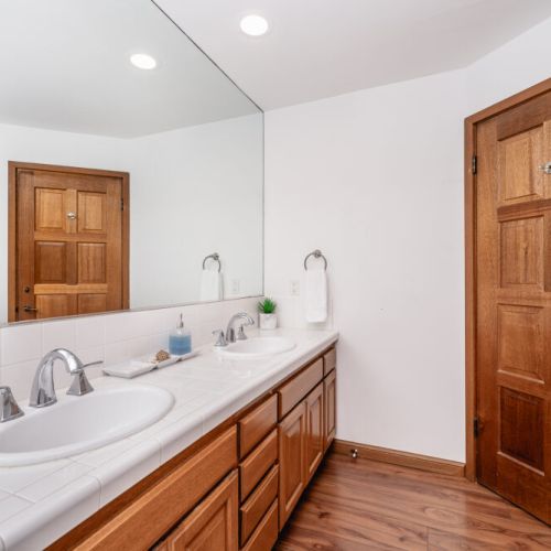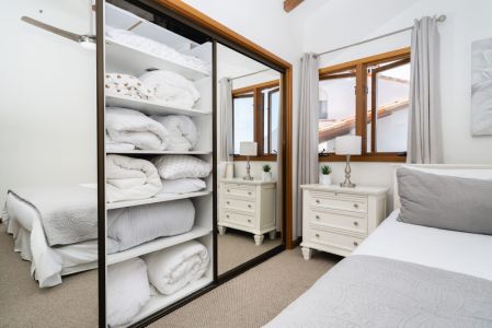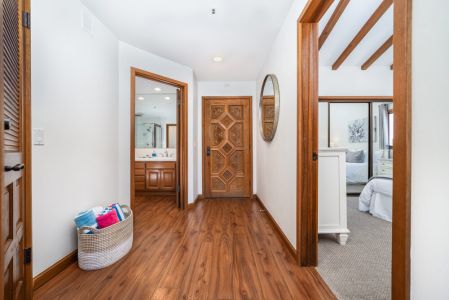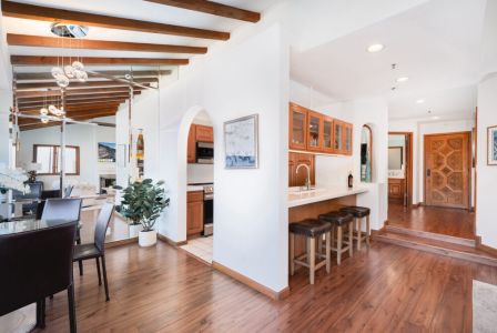 Inside, our condo features a fully stocked kitchen, a comfortable family room, and a beautiful dining area. With two sets of double French doors and extra windows, our place is filled with natural light which really crates an inviting atmosphere. We love how different the condo feels with being located on a corner and having extra windows in both the living room and the bedroom.